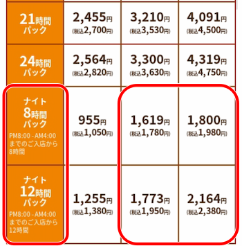 基本は8・12時間パックにナイトパックが設定されているケースが多く、これを利用しない手はありません!