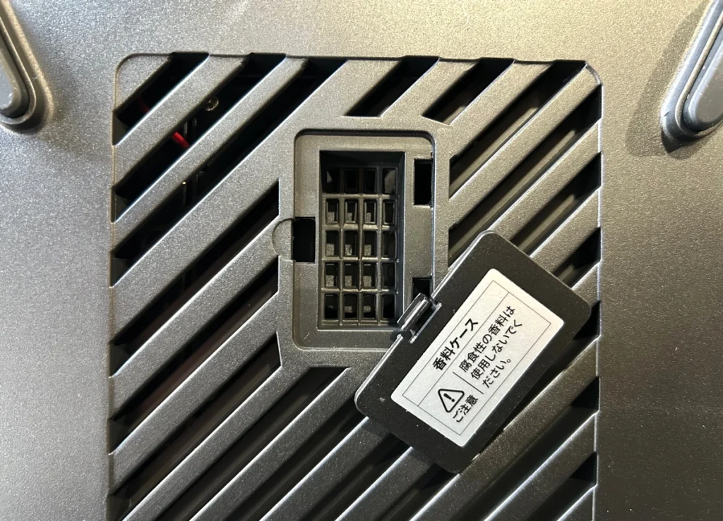 ってことで、本体に電源コードと各種操作ボタンがあることは既にお伝えしておりますので、その他の仕様としては背面にアロマオイルを注げる「香料ケース」があることです!