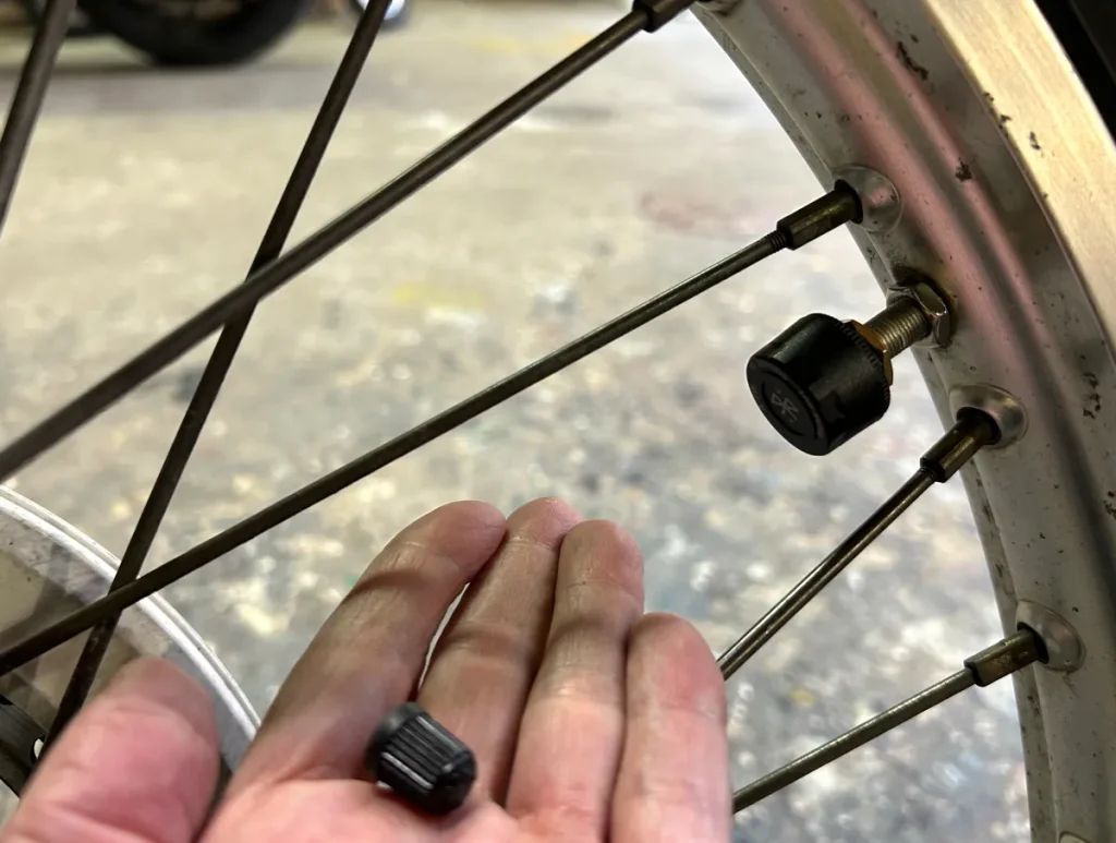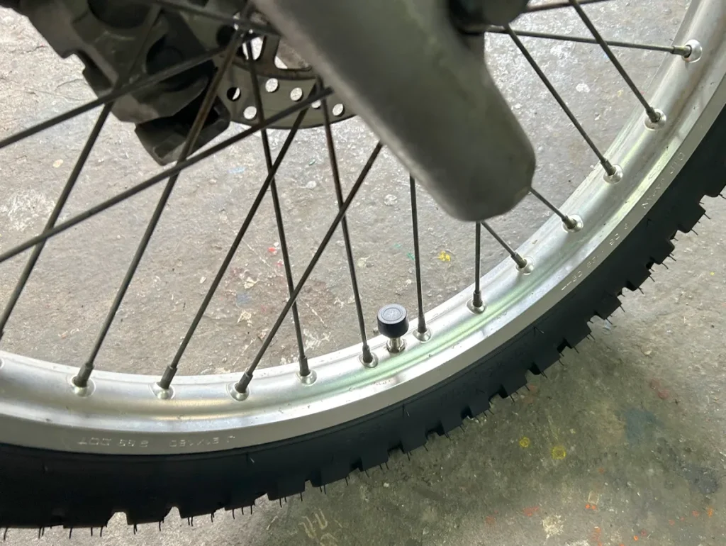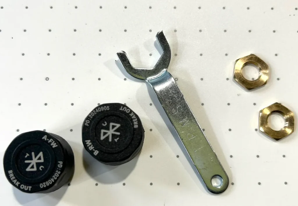タイヤのエアバルブキャップを外して、ストッパーと空気圧センサーを取り付けて、付属の工具で締め付けるだけの簡単作業でございます。