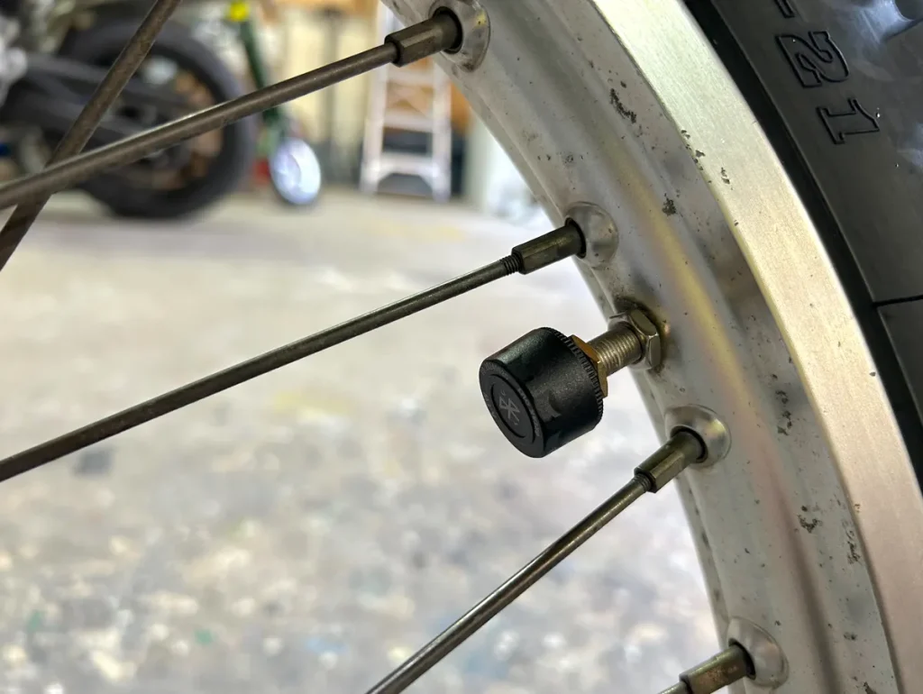 続けてM2Sオプション3兄弟の末っ子(?)のタイヤ空気圧センサーですが、こちらは前後タイヤのエアバルブにセンサーを取りつけることで、常時モニター上で空気圧を確認できるシステムです。