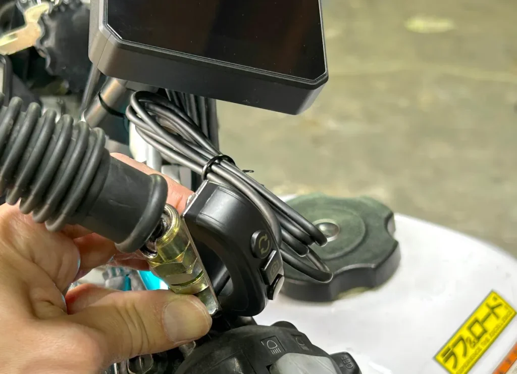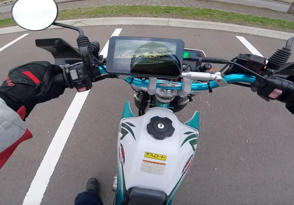 そして最後はバイクに跨った状態でモニターの位置を微調整して、ハンドルを左右に切ってケーブルの引っ掛かりがないことを確認できたら、、、これにて作業完了となります!お疲れ様でした。