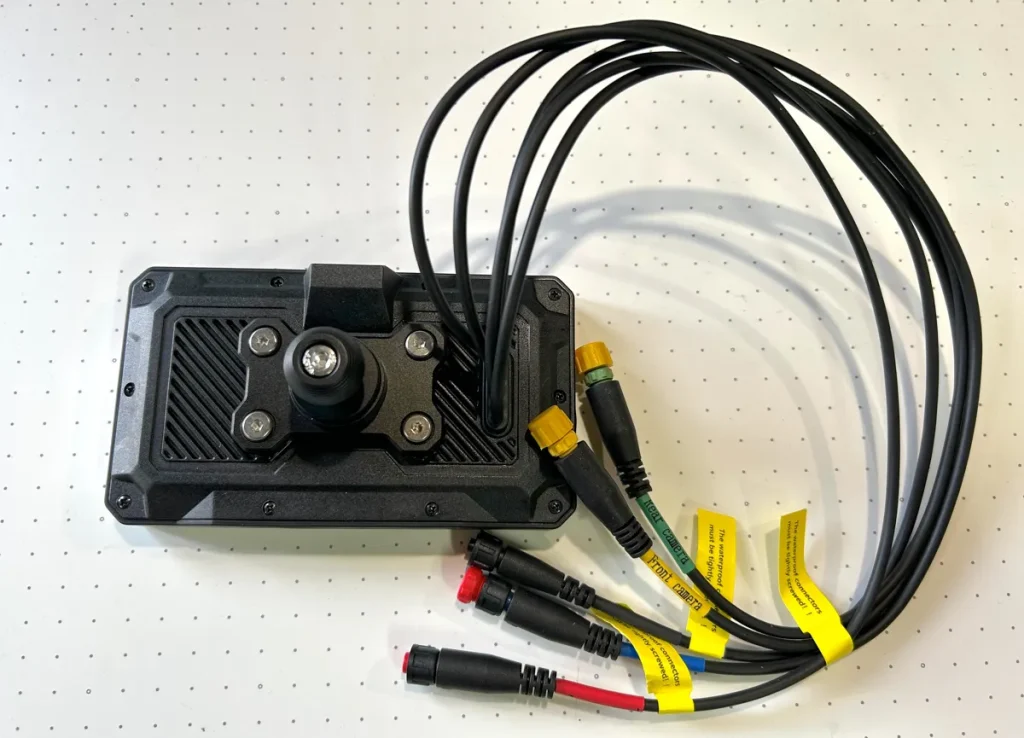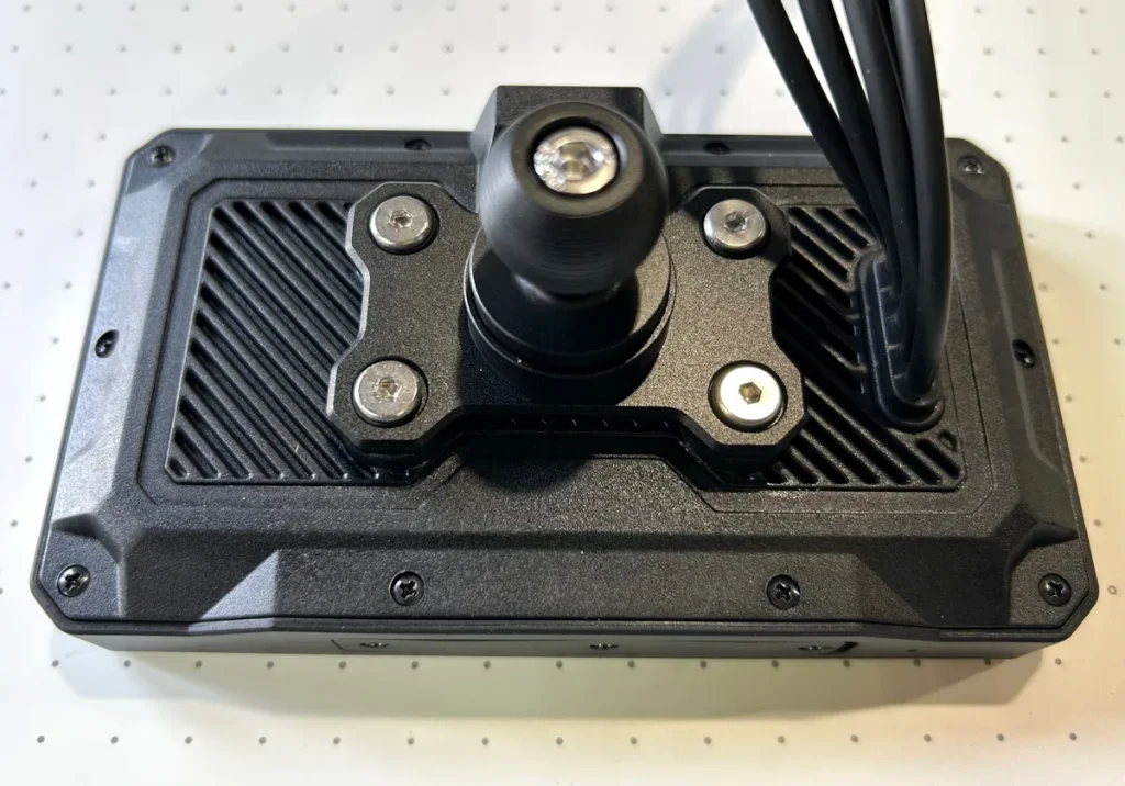 続けて本体の背面にはハンドルマウントとの接続部、それから振動吸収機構が備わっており、例えば電源ケーブルやドラレコカメラなどに接続するコネクタ一式も背面から出ています。