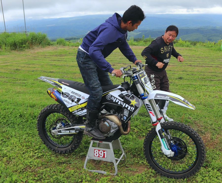 ってことで、オフロードレッスンのファーストステップは、源治さんの個別乗り方講座からはじまりますYO