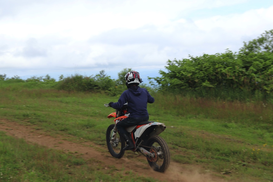 ちなみにレンタル車両は「HONDA XR100、KTM 250exc-F」の2種類があって、前者は身長153cmの奥様でも余裕の足つき&マイルドなパワー、後者は身長173cmの僕で両足ベタ着き&ガチオフ仕様となっているので、お好みで選べますよ(初心者でも250exc-F運転できました)
